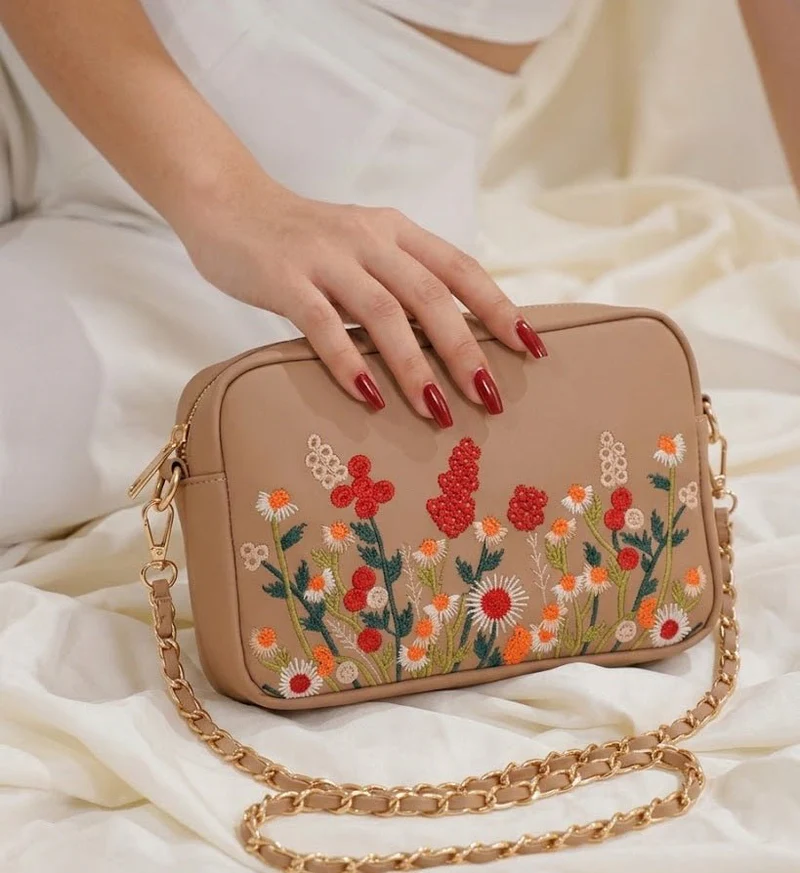 A beautifully crafted shoulder bag featuring intricate floral embroidery on a soft beige base. Designed to add a feminine and elegant touch, this bag combines artistic detailing with modern functionality. Perfect for casual outings, dinners, or special occasions, it effortlessly enhances any outfit.