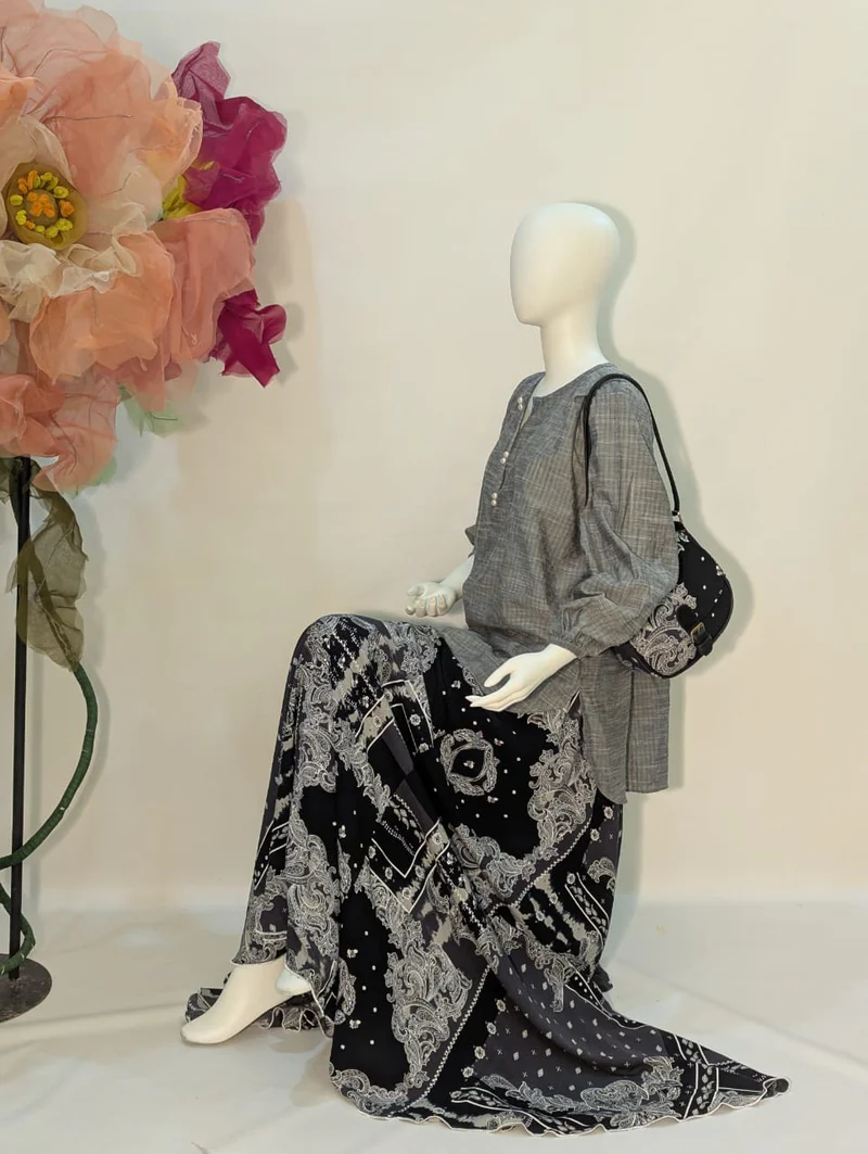Grey Tunic & Printed Palazzo Set pairs a relaxed-fit textured top with flowing printed palazzo pants, styled here with a matching shoulder bag for an effortlessly elegant everyday look